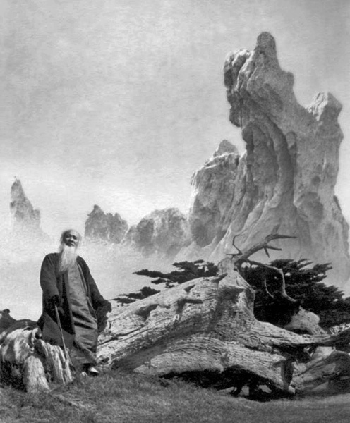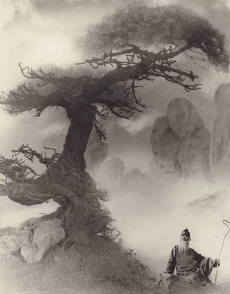 除了以物来影射思想、感情,郎静山的作品中还有许多人物景点。郎静山喜欢张大千的胡子,所以张大千常常是郎静山戏作的模特儿。